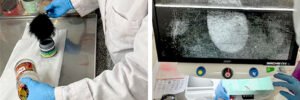Figura 2: Empleo de reactivos pulverulentos (físicos) para el revelado de huellas dactilares y su posterior observación.