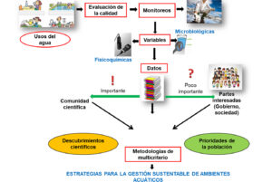 Esquema que muestra cómo los datos obtenidos de muestreo de agua pueden usarse como factores de interés en modelos para toma de decisiones.