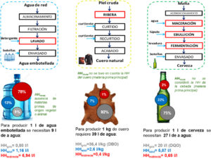 Una de las preguntas que surgió al estudiar la HH de la cerveza a nivel industrial fue ¿qué pasaba con la HH en la producción de cerveza artesanal? ¿También tienen responsabilidad ambiental? En ese contexto, Antonella Murillo (Ing. Industrial), en el marco de una beca EVC (2020) estudió dos procesos de elaboración de cerveza artesanal de empresas salteñas. Con estos datos armó una matriz MET (Materiales-Energía-Tóxicos), para analizar los insumos, energía y efluentes. Considerando la HH, se observó que se necesitaban 11 l de agua para producir 1 l de cerveza, es decir un 110% más de agua contenida en el producto, siendo el componente indirecto el que más influyó en la HH total (Mainardi-Remis et al., 2025).